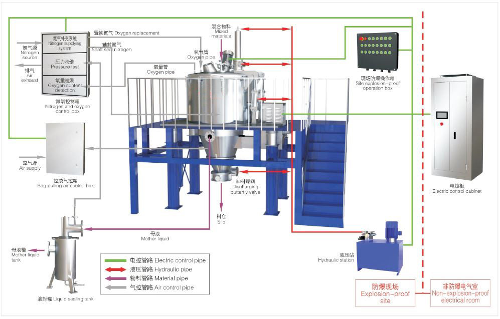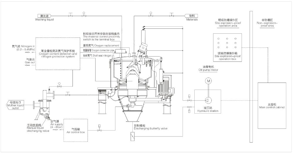 防爆型拉袋离心机采用防爆标准制作,在离心机主机开启前进行大流量氮气置换。通过氧气含量检测、压力检测等途径确保离心机机内气体惰性化,满足离心机运行要求。设备运行后,动态监测氧气含量,进行大流量氮气置换或小流量低压氮气补充,确保设备的隔爆运行要求。