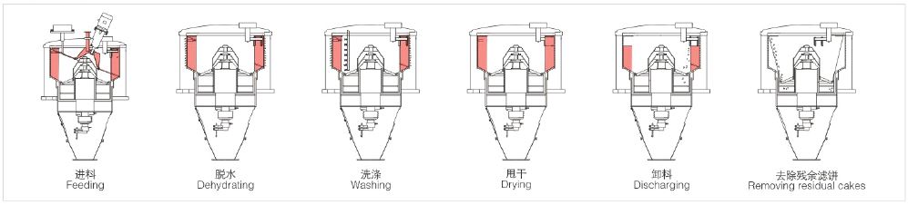 卸料过程进行时,刮刀动作,在刮刀的作用下,大部分物料通过转鼓底部的落料孔排至机外,残余料层通过转鼓内部的自动拉袋机构,产生振荡效果,将残余料层彻底清除。